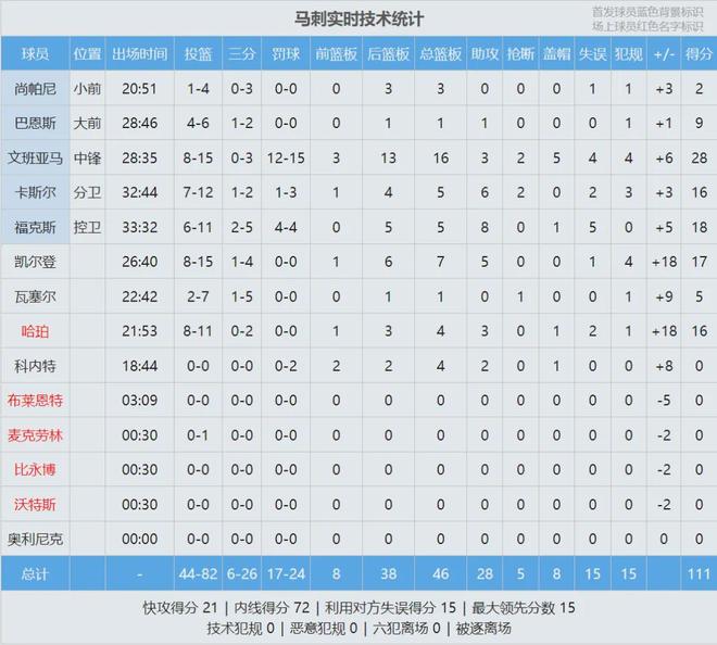 杜兰特跳投被文班大帽,KD不满队友的跑位,挥拳怒吼。第四节打了一半,火箭追到5分。马刺榜眼哈珀连拿6分,最后3分钟马刺领先到两位数。很多投篮机会出现在阿门这里,但他在外线不敢出手。全场结束,马刺111-99逆转火箭。