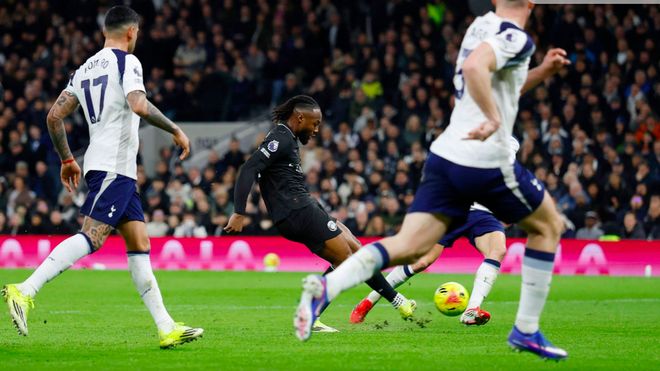 3分钟后,索兰克在禁区内起脚射门,疑似踢到了格伊,热刺扳回一城。