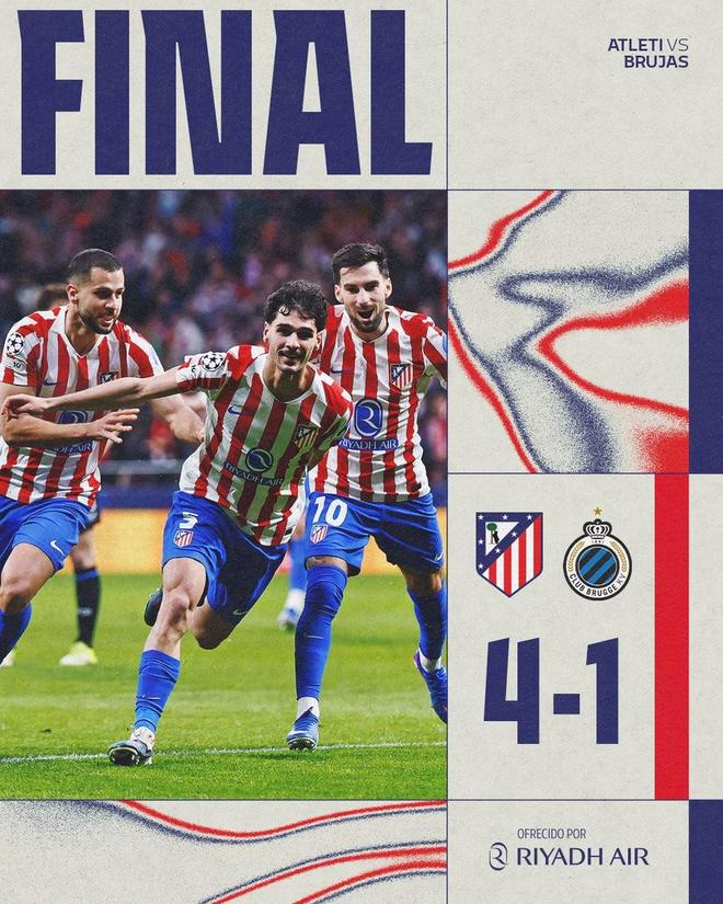 赛后根据Stats Foot的统计,此次面对布鲁日两回合打进7球(客场3-3,主场4-1)也让马竞创造了他们队史欧冠淘汰赛两回合比赛的总进球数纪录。