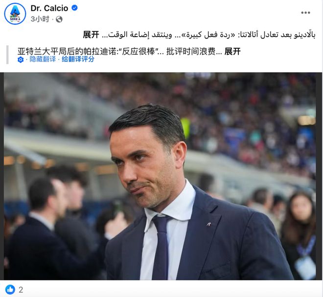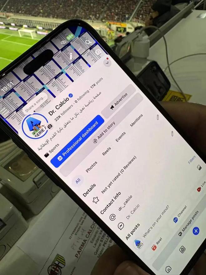 攀谈起来,我才知道,我身边的这位同行果然是自媒体人,他来自伊拉克,在Facebook上运营一个名为“Dr.Calcio”的个人频道。他的个人频道报道的都是意甲相关内容,平台认证是“运动博主”,简介则写着:“一个关于意大利足球的体育主页,涵盖了所有与意大利足球相关的内容。”