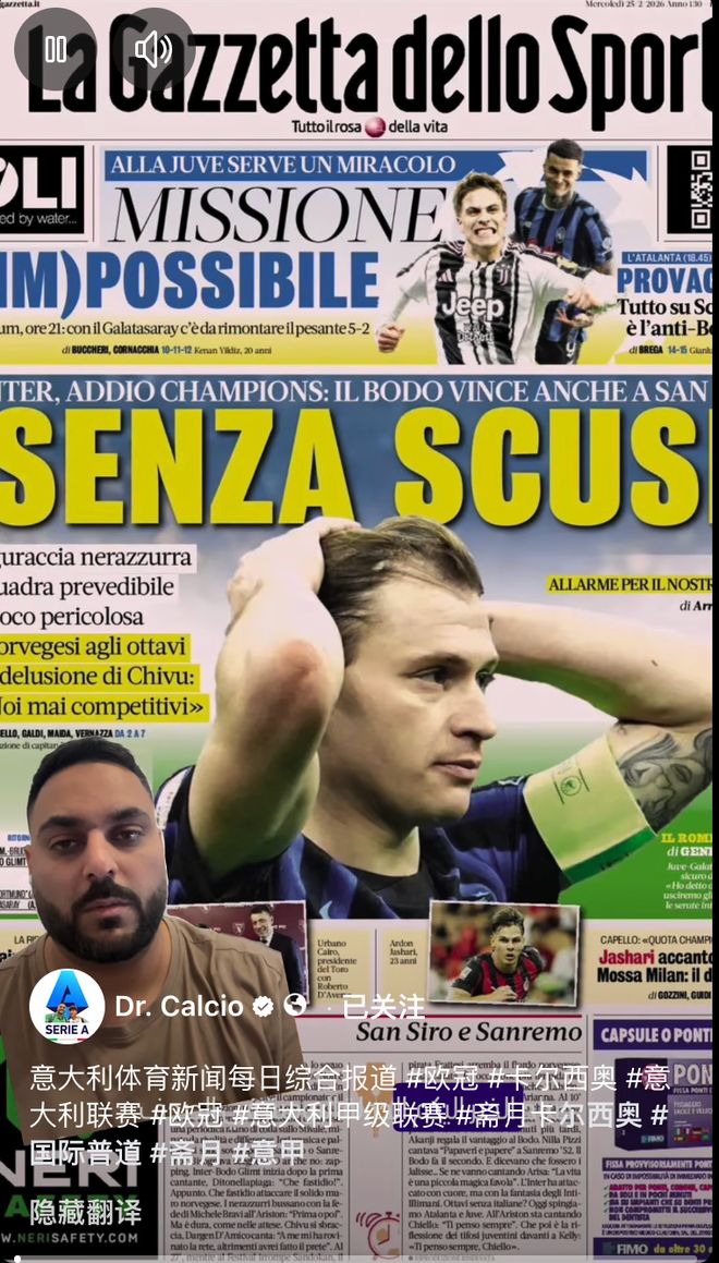 我后来去他的主页看了他发布的内容:照片主要是分享各类资讯;视频则是两类,其中一类是他出镜的视频,背景是《米兰体育报》的封面,我猜测他是对《米兰体育报》的相关封面报道进行延伸解读。另一类则是他现场拍摄的比赛片段。