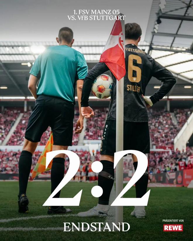 北京时间3月7日晚10点30分,斯图加特客场迎战美因茨。上半场比赛,双方门将屡献关键扑救,力保球门不失,达科斯塔头球摆渡,李在城头槌先下一城。下半场比赛,美因茨攻势不断,内贝尔远射中柱,昂达夫做球,德米罗维奇扳平比分,随后托马斯直塞助攻昂达夫长途奔袭单刀完成比分反超,达科斯塔补射绝平。最终,美因茨主场2比2逼平斯图加特。