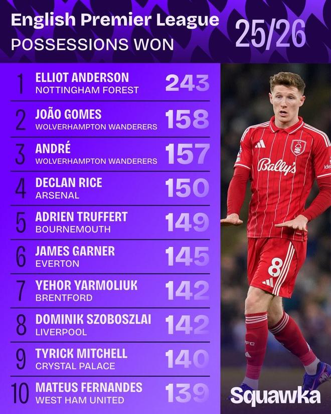 北京时间3月9日,知名数据机构Squawka统计出了本赛季至今英超球员赢得球权次数排行榜,诺丁汉森林中场埃利奥特-安德森以243次断档领先,赖斯和索博斯洛伊进入前10。