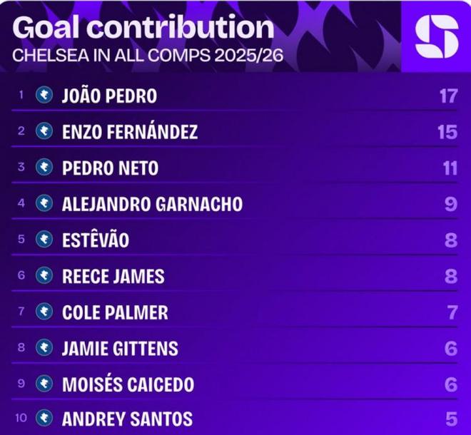 他不仅头球扳回一城,更在最后时刻冷静助攻恩佐绝杀,据Squawka统计,他成为自2022年9月奇尔维尔之后,首位在英超替补登场完成传射的切尔西球员。他以17次参与进球领跑全队,是切尔西进攻端最可靠的终结者。