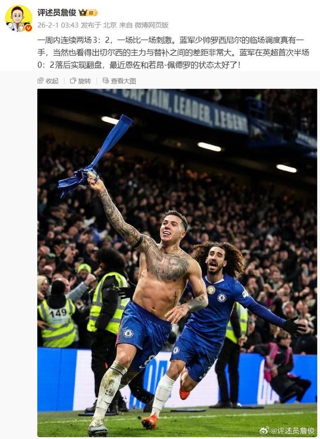 恩佐的绝杀,是其蓝军生涯150场里程碑的璀璨注脚(27球27助),更是这种精神在新时代的传承。从0-2到3-2,球队展现出的不是侥幸,而是一种“要么赢,要么死”的信念。正如著名评论员詹俊所言:“蓝军少帅罗塞尼尔的临场调度真有一手。” 而加里·内维尔则感慨:“切尔西总能在同一场比赛中展现出截然不同的面貌……在关键时刻却突然爆发,成为一股强大的力量。” 这种“变身”能力,正是昔日那支切尔西最特色的。